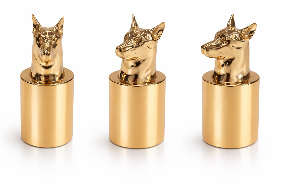 Add a bold, opulent touch to your fragrance line with this premium dog-head perfume cap. Expertly crafted from durable zinc alloy and finished with a mirror-like high-shine gold plating, it delivers both lasting quality and head-turning visual appeal. The meticulously sculpted dog bust sits atop a sleek cylindrical base, creating a striking statement piece for luxury perfume bottles. Precision-engineered for a secure fit, this closure is ideal for high-end cosmetic and fragrance brands looking to elevate their product packaging.